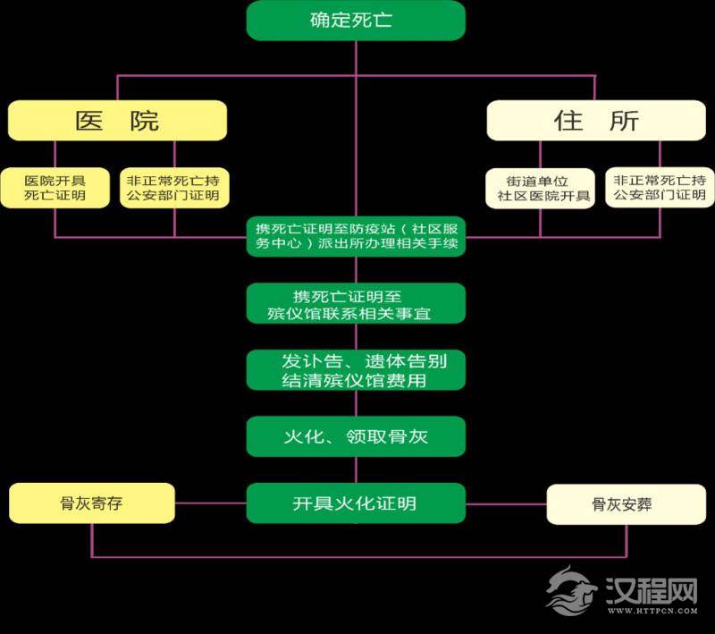 1、在家病逝的。须取得卫生部门(就近卫生院或就医医院)的《死亡医学证明书》,之后到辖区卫生防疫站换取《居民殡葬证》,再带《居民殡葬证》及逝者户口、身份证到辖区派出所销户,由派出所在《居民殡葬证》上签章。