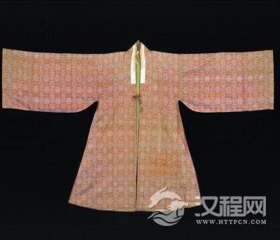 帔直领,对襟,宽袖,裾左右开,领镶白色云、龙、凤、杂宝纹暗花绫缘,衬绿地折枝团花绸里。面为仿宋锦纹样,纹饰分两组:一组排列6个圆环,组成大团花,内饰6个小如意头。另一组排列6瓣花组成的小团花,形成两个散点。两排为一循环单位,构成四方连续纹样,大小团花之间以卷草纹连接。锦地为六枚缎纹组织,经丝分两组:一组为地经,金黄色,经直径投影宽为0.1mm,108根/cm。另一组为纹经,灰色,经直径投影宽为0.1mm,20根/cm,与纹纬交织。纹纬直径投影宽为0.3mm,26根/cm。纹纬颜色有白、月白、宝蓝、淡黄、黄绿、绿色、深绿、粉色、沉香、浅雪青和浅雪灰等13种。