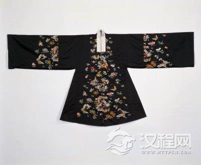 黑地折枝花卉百蝶纹妆花缎女帔,清康熙,身长121cm,两袖通长231cm,下摆宽109cm。