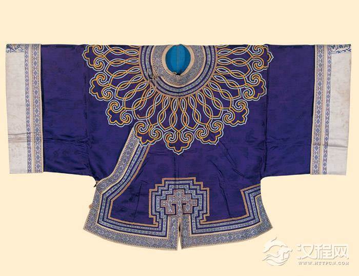 【 清中期 《紫色缎百蝠百寿如意大云肩女马褂》 】长82cm。鹅黄色缎地圆领,右衽,左右开裾,滚边、镶边,层次变化,盘双层福禄如意,十六大云肩,前、后开叉处呈大如意锁纹,马褂通身缎地百蝠团寿纹,两侧白色缎地袖上彩绣鹭鸶、孔雀、鸳鸯等,钉金绣盘肠纹饰。此款应为年轻贵族女子生日盛装。
