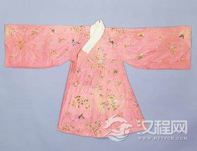 粉色实地纱地绣花卉蝶纹褶子,清康熙,身长134cm,两袖通长248.5cm,下摆115.5cm。清宫旧藏。