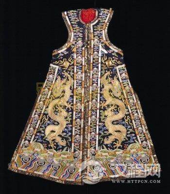 石青缎绣金龙棉朝褂,清乾隆,身长130cm,肩宽40cm,下摆宽120cm,左右开裾各长80cm。清宫旧藏。 褂丝质。圆领,对衿,左右开裾,片金缘。石青缎地上绣两条上升的金龙,并彩绣流云飞蝠、海水江崖等纹饰,间以缉珍珠、珊瑚米珠团寿字,外环缀捶鍱花卉嵌珊瑚、绿松石、金板,以钉珊瑚、珍珠排珠相连。朝褂上缀银鎏金錾龙纹扣9枚。内挂红色暗团云龙金寿字织金缎里,中间薄施棉絮。 这件朝褂集多种工艺及刺绣针法制成,纹样层次鲜明,立体感突出。平金和缉米珠工艺在清代服饰上并不少见,但金板嵌珠石用于装饰皇后服装则为清乾隆时期首创。 此朝褂为清乾隆帝孝贤纯皇后秋冬季御用,将其套在朝袍外,与朝袍和朝裙共同构成礼服,用于元旦、万寿、冬至三大圣节以及其它重大典礼场合。