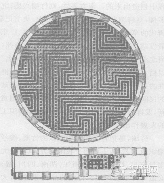 战国秦汉时期,我国古代的编结工艺已经达到很高的水平。湖北江陵马山战国楚墓出土过一些距今2400多年的竹席、竹扇、竹笥[si四]和竹筐。竹席周边织纵横人字纹组成的大回字纹,中间织相间的纵横人字纹。竹笥的经、纬蔑条分别用漆染成红色和黑色,以复杂的工艺编成丁字勾连的四方连续几何图案,十分精致美观(图10)。湖南长沙马王堆一号汉墓出土了竹编用具近百件,品种有竹笥、竹篓、竹熏罩、竹席,还有草席,不仅编制工艺复杂,造型也很精美。这都为研究我国古代编结工艺的发展提供了可靠的资料。