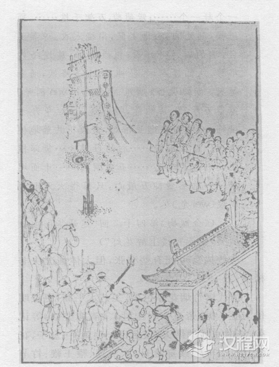 明清两代,爆竹烟花极为流行。“糖瓜祭灶,新年来到。闺女要花,小子要炮。”新年春节,婚丧嫁娶,无论贫富,都要燃放爆竹烟花。明清爆竹烟花的花色品种远远超过宋元,制作技术也日益精巧。明代放烟火俗称“放盒子”。因为当时烟火多是把药线烟火编排好后放入盒子里,搭架燃放。反映明代生活的小说《金瓶梅》中有一幅放烟花的插图,这是我们现在能见到的最早的放烟火图(图30)。图中放烟火的木架高耸,上面挂满各式各样的烟火爆竹,正在燃放、变幻着各种各样的颜色和图案,周围的观众仰首观看,这是明代烟花发展水平的真实写照。该书中对西门庆拦门放烟火是这样描写的: