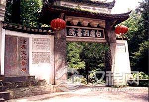 白鹿洞书院在唐代(公元618—907年)时原为李渤兄弟隐居读书处。根据文献记载,“渤养白鹿自娱,人称白鹿先生”。后来李渤任江州刺史,旧地重游,于此修楼建亭,引泉植花,遂成为一处游览胜地,取名白鹿洞。五代南唐升元年间,在此建立了“庐山国学”;宋(公元960—1127年)初扩建为书院,并正式定名为“白鹿洞书院”。白鹿洞书院是中国历史上第一所完备的书院,与岳麓、雎阳、石鼓并称“天下四大书院”。北宋末年,书院毁于兵火,南宋淳熙六年(公元1179年),朱熹出任南康太守,重建院内的建筑,延请名师,充实图书,亲临讲学,并奏请赐额及御书,于是书院的名声大振,宋时著名的哲学家陆九渊、王守仁等都曾在此讲学。后代书院又几经兴废,现存建筑多是清道光年间修建的。