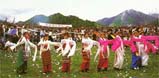 除夕前晚上,按照传统习惯,每家还给猫、狗准备一顿美餐,既有肉又有饭。如果猫、狗先吃肉,后吃饭,那么预兆来年风调雨顺。夜间各村寨的藏族群众,都身着艳丽的民族服装,聚集在寨房的宽敞广场,大家围着篝火,对唱山歌,跳“锅庄”,并以青稞酒、酥油茶助兴。舞时以胡琴伴奏,边唱边舞,舞步整齐划一,踢踏声,歌声,乐器伴奏声交织一起,情绪激昂。节日期间,有的村寨还举行赛马、射击比赛。大年十五,吃完早饭,男女老少都收拾得干干净净,带着食品和酒肉,成群结队,到预定的地方转山。