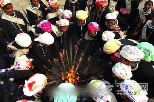 | 佤族妇女在取新火。在一年一度的“取新火节”上,佤族人都将旧火熄灭,然后由德高望重的老人用古老的钻木取火的形式燃起新火,寨子里的每家每户都要到造新火的地点取新火,拿回家重新燃起,预示新的一年吉祥安康。 |