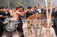 | 佤族“剽牛节”上,一位佤族勇士将锋利的剽器扎进牛的软肋中。佤族是一个崇敬牛的民族,每年凡遇重大节日和祭祀活动,佤族都要举行剽牛仪式, |