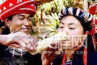 | 佤族青年向姑娘敬竹筒水酒,祝贺春节。敬竹筒酒是佤族的古老习俗,每逢过年,佤族男女都要互敬竹筒水酒,相互祝福。 |