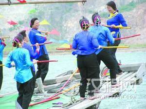 九时,迎亲的两条渔船前往新娘家迎娶。一离开码头,铜锣开响,鼓声阵阵,两条船船舷边上的渔女们就手持长竿,模仿起划桨的动作,和着节拍,跳起了欢快的“划桨舞”。以前人们是划着船去迎亲的,现在渔民用上了现代化的渔船,不再划船桨了,渔民们就把划桨动作演变成了舞蹈,用这种方式来保存久远的记忆。
