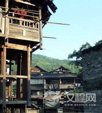 苗族、土家族住宅,同宗同姓的人聚居成一村一寨,以姓氏做寨名,如李家湾、向家坡。住宅由正屋、偏屋、木楼三部分组成。正屋一般修六扇五间,有"三柱四棋"、"五柱八棋"或"七柱十一棋"。"七柱十一棋"的大屋为十扇九间。住山地的,多依山傍水建造坐北朝南、纯木结构的居脚楼。吊脚楼为每扇四柱撑地,横梁对穿,上铺木板呈悬空阁楼,绕楼三面有悬空的走廊,廊沿装有木栏扶手。木栏上雕"回"字格、"喜"字格、"亚"字格等吉祥图案。凭桩可观景,可晾晒衣物。阁楼屋脊以瓦作太极图形,四角翘檐,玲珑飘逸。屋脊与檐均用灰浆安砌花格窗,上嵌玻璃,涂刷油漆。