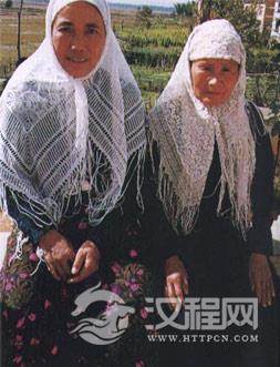 由于散居的原因,使回族在服饰上最具有民族特色的就是礼拜帽,一般是用白布制做,式样为无檐小圆帽,也有戴黑色的,最初是作礼拜时戴,现在已成为民族标志,平日也随处可见。回族妇女习惯戴披肩盖头,只把脸露在外面,根据年龄的不同,选用的颜色有所不同,姑娘用绿色的,中年用青色的,老年用白色的。