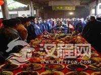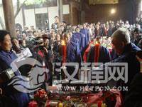 祭祖的主角是族长,陪祭有各房房长、缙绅、有功名者。司仪由本族秀才或学校优等生担任,称为礼生,共二十名。其他族人在后面侍立。整个拜祭过程分起乐、献供、跪读祭文、祝福、轮拜祖宗等。只见两礼生拖着长声齐喊:祭祖大典开始,起鼓,再起鼓,再起鼓……鸣磬三点!”一礼生击鼓三通,一礼生撞鼓三下。两礼生再喊:“立祭者恭立……扶祭者同恭立……一叩首,二叩首,三叩首……,一上香,二上香,三上乍!”有礼帮族长点香。主祭者陪祭者叩头、上香如仪。接着是起乐、献供,此时乐队晨候一旁,热烈的梅花锣鼓响起,乐声中,余下的礼生将供品递给族长,再摆上供桌。两礼生依次高喊:“献旱鹰(整鸡)、献殿肩(猪蹄胖)、献 蛟须(银鱼须)、献鲜鳞(全鱼)、献玉粒(米饭)、献春茗(茶)、献爵(酒三杯)……。”