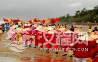 2、祭神:祭神的具体时间为节日的当天下午三点钟左右。祭祀仪式开始后,首先由主祭者带领人们迎接来自海上、天宫各位神灵、祖先进入神位,读祭文,紧接着是向诸神敬酒和献礼。在祭祀之后进行娱神的过程中,表演内容不但穿插了人们喜闻乐见、反映生活情趣的古诗词演唱、历史故事说唱等,还要唱"进香歌"、跳"进香舞"、"进酒舞"、"天灯舞"等。