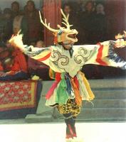 赫哲人参加跳鹿神活动,一般是在每年的“九月九”进行。每当“九月九”到来前,活动的组织者——萨满就要提前几天告诉大家,听到消息的赫哲人、特别是那些想还愿的赫哲人,则把萨满请到家来,让萨满说一说当天将要进行的活动。比如,活动从什么开始,到什么时候结束。活动中都有哪此内容,哪些活动在先,哪些活动在后。人们参加活动时有没有什么忌讳,想要还愿的人需要准备哪些祭品,还愿过程中需要做什么,或者需要注意些什么等等。当萨满一五一十地把要求讲清楚后,赫哲人便为跳鹿神活动紧张地忙碌起来。跳鹿神当天,赫哲人像过节似的,男女老少自发地参加到这一充满神秘而又刺激的活动中来。跳鹿神活动开始后,萨满便成为活动中的核心人物,他先在自己家中祷告一番,接着,屯中少年数人击鼓摆腰铃助兴。摆腰铃毕,萨满全副神装,请年轻力壮者手拿鸠神杆、神偶、神刀击鼓,从萨满家中边跳边唱鸠神歌而出。在屯中跳,到其他人屋里跳,所去人家对此早有安排,其户数为单数,甚至有的去几十里外的村屯跳,据说这样可赶走藏在各村屯里的鬼怪和病魔,以保护人口平安。一些病愈康复的赫哲人以及一些求子得子的赫哲人,都要借此机会了却他们的心愿,更多的人则是祈求一年平和、祥顺、幸福、安康。大家在全屯各户屋内房外边唱边跳,场面前呼后拥,好不热闹。20世纪20年代,跳鹿神活动在松花江下游的赫哲人村屯中盛极一时,特别是在街津口村等赫哲族村屯,有时参加人数达到200人之多,个别跳鹿神活动甚至由街津口村一直跳到相距四五十里的额图村,一些老人或儿童自始至终地参加跳鹿神活动。他们甚至不顾路途遥远,乘船从水路去参加跳鹿神活动。随着社会的进步,医疗技术水平的提高,人们对萨满的信仰逐渐消失了,传统的“跳鹿神舞”也逐渐被人们所淡忘,人们只能从赫哲老人的回忆中,从说唱“伊玛堪”的故事中,乃至从赫哲人喜庆活动或重大节日所进行的表演中,才能看到或听到有关跳鹿神的故事。