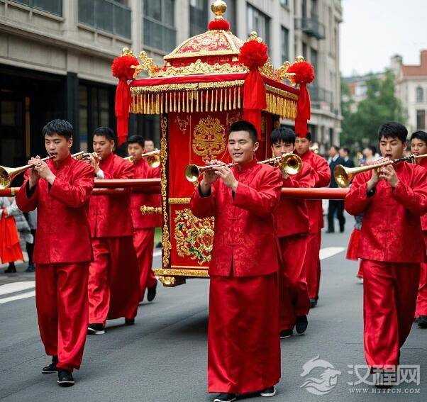 迎亲队伍在院门外摆开阵仗。打头的童子手持缠着红绸的竹竿,竿头系着寓意“开枝散叶”的柏枝与石榴。紧随其后的鼓乐班卖力吹奏《鸾凤和鸣》,腮帮鼓胀的唢呐手脖颈青筋暴起,将欢腾的旋律送上云端。最惹眼的当属四位“全福太太”,她们须得父母双全、儿女成行,此刻正捧着装有红枣、花生、桂圆、莲子的描金漆盒,每走三步便朝人群抛撒一把,惹得孩童们笑闹争抢。
