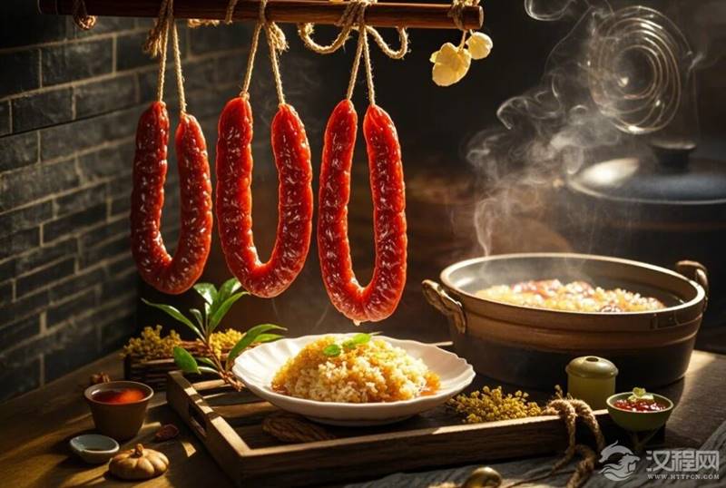 顺德祠堂的冬至宴上,切成蝉翼状的腊肠是祭祖必备,甘甜滋味隐喻着家族绵延的期许;湘西苗家"赶年节"的长桌宴,成串熏肉悬挂如黑金铠甲,咸香中沉淀着族群迁徙的沧桑。当"老广"用腊味煲仔饭慰藉南洋游子,湘西汉子揣着熏肉干远走他乡,食物成了流动的故乡。