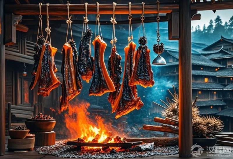 喀斯特地貌的裂隙间藏着生存的智慧。当商队驮着盐巴在茶马古道上颠簸时,湘西山民发明了"三腌三晾"法:先用粗盐腌透血肉,再用米糠熏出铠甲般的保护层,最后悬在火塘上方经受四季烟火的浸润。腊月里,谁家熏肉黑中透亮,便意味着主妇的持家本领高超。凤凰古城客栈老板娘吴姐演示传统吃法:取巴掌大的熏肉,在炭火上烤得滋滋冒油,就着酸辣椒直接啃,"咸味扎进肉里,才是我们山里人的硬气。"