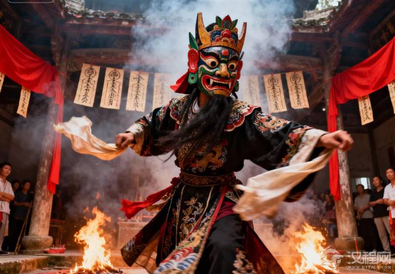 他们头戴彩绘木雕面具,或青面獠牙,怒目圆睁;或慈眉善目,宝相庄严。在跳跃的火光与缭绕的烟雾中,最令人心悸的,是每一张面具眼孔后,那双属于“人”的眼睛。它们时而低垂,仿佛洞穿幽冥;时而又倏然抬起,目光如电,扫过屏息围观的村民。那目光,沉静如古井,却又仿佛承载着千钧的重量——它究竟在望向何方?是常人不可见之“鬼”,还是我们这些凡俗“看客”?