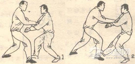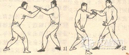 高级的拿法叫“串九曲珠”是太极拳的上乘功夫的表现。当我用手搭住对方手臂时,就全部控制了对方半身九大关节(肩、肘、腕三大臂关节;颈、脊、腰三大身躯关节;胯、膝、脚腕三大腿关节),有如串珠九曲,故《十三势行功心解》有”行气如九曲珠,无往不利”之句。太极拳大师吴图南先生形容为“敌欲攻而不得逞,敌欲变而不能,敌欲逃而不得脱”的欲进不得、欲退不能的困境。图11、12中,乙完全受制于甲 (着白色上衣),僵化于原地。甲凭借浑厚的功力,搭乙手,劲力一直贯穿到乙之足根,乙双脚有如被钉住,动弹不得。