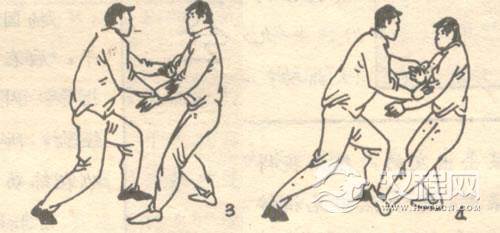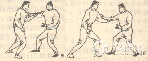 中级拿法是单手拿,不换手。图9、10是单手拿的实例:甲(着白色上衣)乙对抗,甲出右手按乙前胸,乙出左手上拥相抗(图9);乙的拥劲被甲拿住,乙为摆脱甲的控制而向后撤步,甲随着跟进,继续用右手拿住乙的棚劲,不使乙解脱。 (图10)
