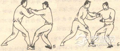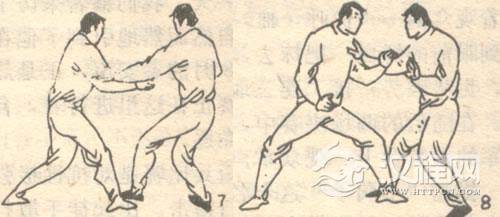 图5—8为换手拿的实例: 甲(着白色上衣)乙对抗,甲出左手搭住乙前胸,发长劲按乙,乙出右手上棚与甲相抗(图5);甲继续发长劲按乙,乙招架不住而后撤一步,甲跟进并换右手,仍按乙前胸,乙出左手上拥与之相抗(图6);甲拿住乙之拥劲,继续按乙,乙不得已又后退一步,甲又跟进,换左手仍按乙(图7);乙又后退,甲又换右手按乙(图8)。如此,甲始终拿住乙劲,不使其发劲或摆脱,乙一泄而不可止。