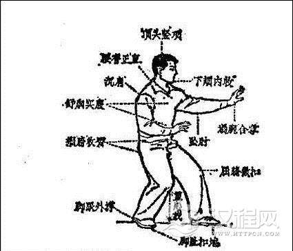 要点:1.上体要正直,不俯不仰,侧向前方,与目视方向成斜45。。头向上顶,颈要竖直,面部要自然,牙齿轻扣,下颊略向内收。2.两肩向下松垂,肩窝处略向后缩,左臂(前手)肘部下垂,不可伸直,左手食指要向上挑劲,拇指尽力向外撑开,虎口成半圆形,掌心内含,右前臂靠在腹部右侧,右手五指也要撑开,腕部要塌住。3.胸部略向内含,不要紧张用力,两肋肌肉舒展(束肋),心胸平静空虚,腹部自然充实(沉气),但不要故意鼓腹,背部肌肉尽力向两侧伸展(拔背),腰要塌住;臀部不可向外突出,肛门部位的括约肌注意向里收缩(谷道内提)。4.两胯略向后收缩(缩胯),两膝微向里扣,前膝屈弓不要超过踝关节;臀部与后脚跟上下相对;两脚脚趾扣地,重心偏重右腿;前腿既虚且实,承担少部体重。5.呼吸要自然,精神要集中,身体力求稳固。