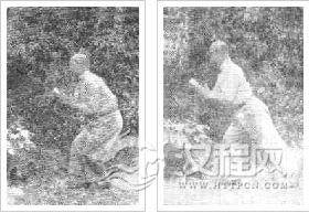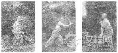 即接前势,随即左手向前,成捉鹰势,左右手齐下落至裆前,左足随即踩出成弓箭步。