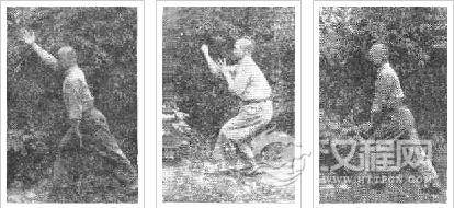 身体往下束(亦作缩),两腿微曲,即拳谱所谓存也。左足前进一步,右足即前进去,落地时左足提起,即所谓践也。此时仍如前势,身往下束,项缩,头微仰,目平视,含胸拔背,沉肩坠肘,肘要贴切;左手作鹰爪状放于右手上,右手握拳放右腿上,背要圆,三弯要弯。即拳谱所谓就也。