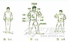 1.身体自然直立,两脚开立,与肩同宽,脚尖均直向前方,两臂自然下垂;眼向前平视。(图5--4)