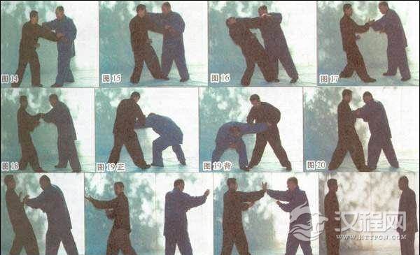 动作3:乙伸右掌贴甲左肘上撮,迫使其肘尖向上;同时乙左掌向上捋带;右掌拇指为导向,由上向右做臂外旋,同时向下压甲左肘和手臂;甲随乙捋带上左步;目视对方(图19正、背)。