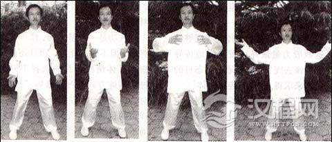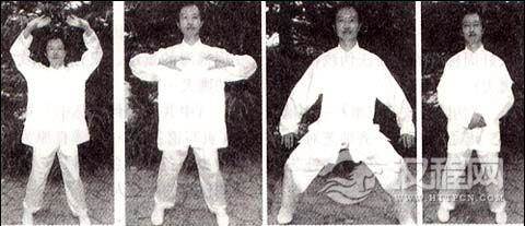 接上式,上身轻起,收左足,站距如肩宽,与前面所述身形一样。