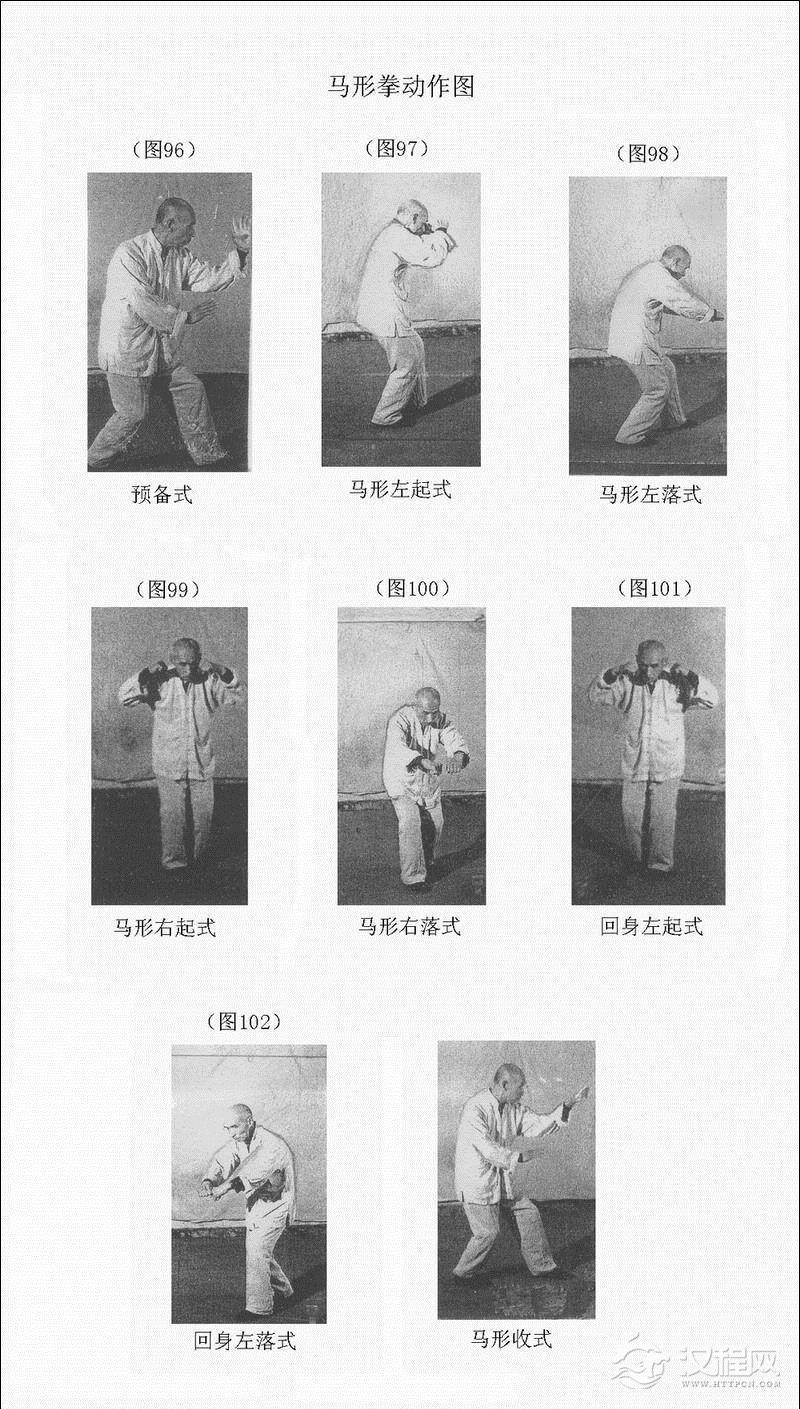 马者,兽中最义者也。有疾蹄之功,有垂韁之义,有跳涧之勇。在腹内则为意,在拳中而谓之马形。其拳顺,则意定理虚而道心生,其拳谬,则意妄气努,而手足五脏失和,清气不能上升,浊气不能下降,手足亦不灵巧。古人云:意诚而后正心,正心则理直,理直则拳中之劲不致妄发矣。《拳经》云,人学烈马疾蹄跑,争功须要胆气豪,英雄四海扬烈武,定知此式得名高。这是对马形的形象描述。习学者于此马形尤须加意。