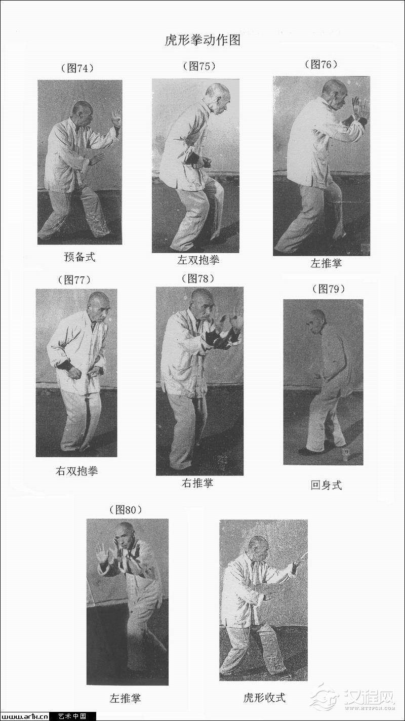 虎者,为山中兽娄之王。有伏虎离穴之式,有凶猛扑食之勇。在腹内为肾水,清气上升。《丹书》云,虎向水中升也。又为风,风从虎,在拳中而谓虎扑。此形之劲起于臀尾(督脉又名长强穴)。其拳顺,则清气上升,脑筋充足;其拳谬,则浊气不能下降,诸脉亦不通矣。《医书》云,督脉为百脉之源,督脉一通,百脉皆通。《拳经》云,臀尾打落不见形,猛虎坐卧藏洞中,背尾全凭精灵气,起落二字自分明。这是对练习虎形的形象写真。习学者务须格致虎形之理,而得之于身心,以通诸窍。