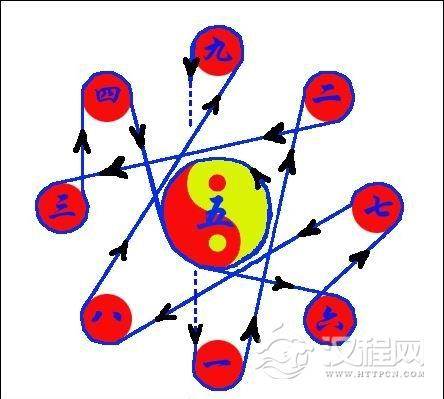 练习时如穿九宫路线图:从一宫开始左旋绕走至二宫处变右转;绕走到三宫处变换左旋;绕走到四宫处变右转;绕走到中央五宫处变左旋,此时要在五宫转走一小圈变左旋到七宫处;七宫变右转到八宫处变左旋;再绕走到九宫。