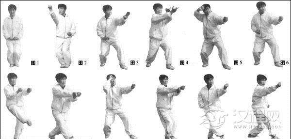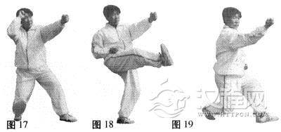 身体下沉或坐盘式,左拳螺旋撤回,右拳螺旋横击出为原地横拳(图18),同时急速起后腿踢出(蹬踏劲),前拳变后拳,后拳再直劈出,打出二力分争的刚猛劲,连踢带打为龙虎相交(图19)。