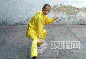 金鸡独立紧攀弓:右手复斫,右足搓转,左拳自上插下,左足钓马步进半步,右足还连枝,即六路拳冲钓马步。