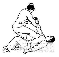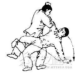 ③我不容敌缓势解脱,两手继续用力向左下拧敌右腕臂之同时,右腿随身体左转之势后屈缠别住敌右腿,用力向后上勾挑,迫使敌在上拧下勾挑之合力作用下左转仰身而失衡后倒。目视敌上盘。