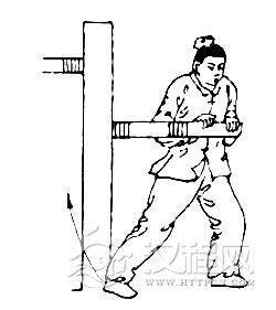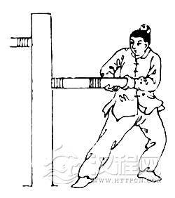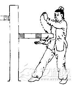 木桩功:①面对木桩站立,左手前上举护面,右手仰掌前下伸护腰,使桩臂端置于胸腹前(活木桩中盘手臂的肩关节和肘关节处均为强力弹簧连接),宁神静气,运力于两掌,目视桩臂。