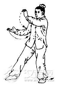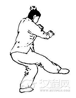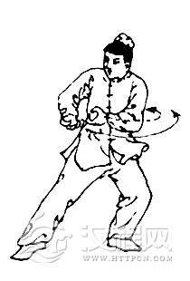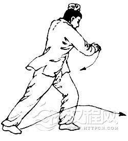 ③身体左后转,右脚向右后用力滑蹬成左开弓式。同时,左手外旋,右手内旋,向左后猛力拧,意力运达两手十指及右脚踝外侧,目视双手。