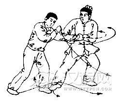 试招二:①敌我对峙,若敌以右格斗式滑步突进,左拳砸压我前锋手引我注意力,右拳同时攻击我中盘空位,我则撤步右闪以右低玄虚式避敌拳锋芒。当敌拳击空落于胸前时,两手即左采右托抓住敌右腕臂,顺敌拳冲势向左下牵动敌重心。目视敌右腕臂。