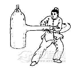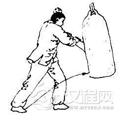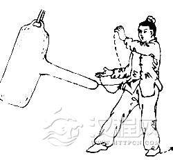 吊袋功:①双手推动吊袋,吊袋的一侧连接一条平举手臂,使吊袋手臂向身前回摆,同时左脚撤步以右高玄虚式对袋臂,两手左上右下护住头面和腰肋,迅速运劲于两掌。目视袋臂回摆。