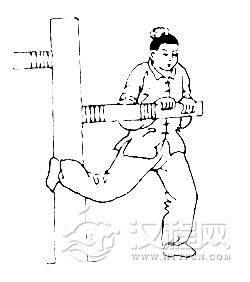 ③身势左转,右脚滑蹬成左开弓式之同时,两手扣抓住桩臂端逆时针向左下猛力拧。注意体会发力的猛烈深沉感和拧的抗衡感。目视桩臂端。