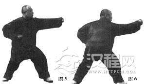身体右转,右脚垫步,左脚向前进步,震脚成四六步,同时右拳回拉置于腰际,左拳成鹰爪状从上向下抓落(图5)。要点:同上势。