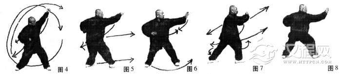 要点:右手全靠腰部带动,滚臂下拦,内含缠丝劲。