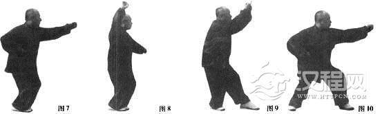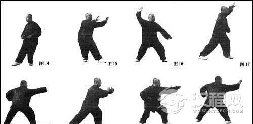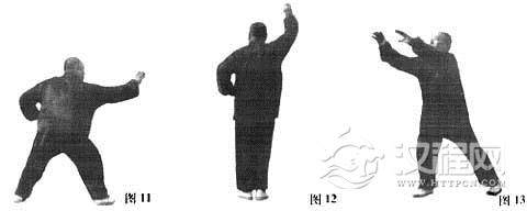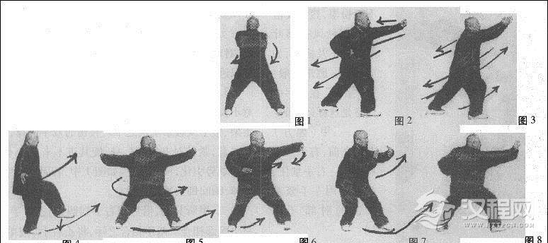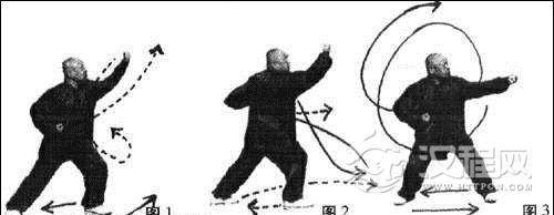 要点:进步全靠腰胯带动,两脚跟要同时中辗震,猛然发出沉坠劲,双掌都要划圆,内含撕拉劲,不准直出直进。