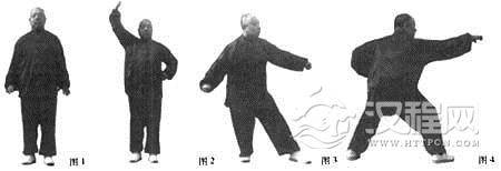 接上式,右足不动,左足向前抬起,成右独立式,双臂由上向两侧掸出(图4),要求抬足不要太高。