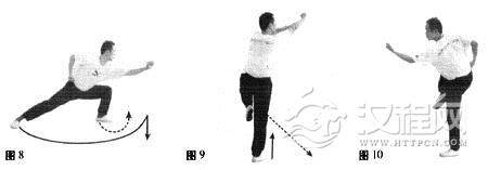 要领:身势由高转低与前俯出拳要一气呵成,出拳并非只是手臂用力,还要借上身前俯的前冲之势。技击作用:瞄准时机,瞬间突击其要害部位。七、流星捶突然起身,右脚向右前方跳步,向左转身,提左膝,左手由胸前向前、向外抓出,抡右臂向外、向前、向内弧线摆击(图9)。