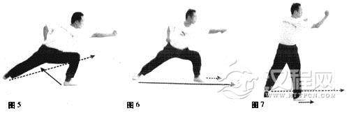 右脚向右前方迈一大步,后脚跟进半步,侧身下沉,上身略向前倾,击右拳,左拳收于腰间(图5)。