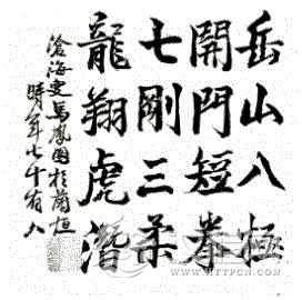 八极是流传有绪的古典拳术,“诚为国术中最名贵之精品也”。从传统的类属上讲,它应该属于短打类。这是马凤图先生生前一直不断加以阐扬的一个观点,我个人也愿意继续对这个观点有所诠解。先父曾对八极有一个著名的题词: “岳山八极,开门短拳;七刚三柔,龙翔虎潜。”